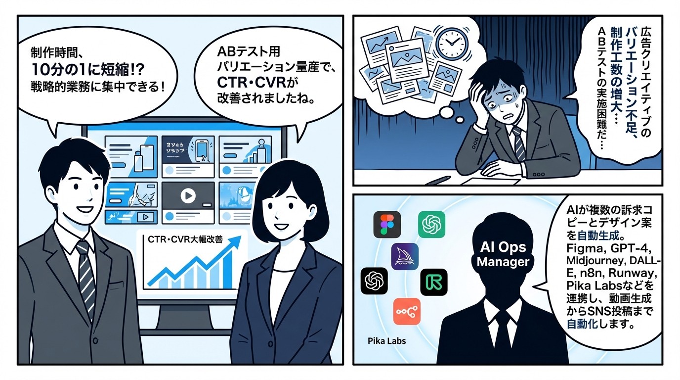 クリエイティブ制作時間を大幅短縮し、ABテスト用バリエーションを量産。広告CTR・CVRが改善され、デザイナーは単純作業から解放されて戦略的業務に集中できるようになる。