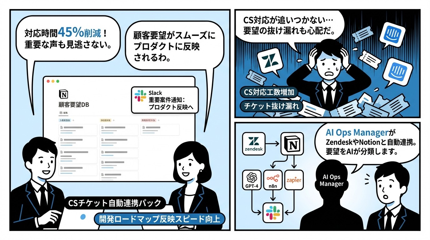 ZendeskやIntercomのチケットをNotionに自動同期し、AIが要望を分類・優先度判定。CS対応時間を45%削減しながら、重要な顧客の声を見逃しません。