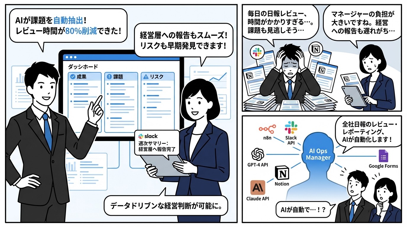 Slack/Notionに投稿された日報をn8nが定期取得し、AIが「成果」「課題」「リスク」を自動分類。週次で全社サマリーを自動生成し、経営層にSlack通知。マネージャー向けには個別フィードバックをAIが自動生成。