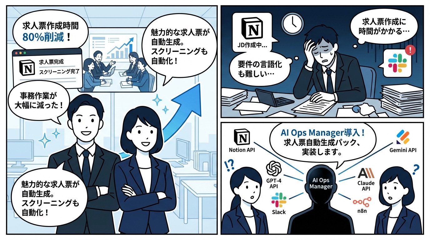 求人票作成に時間がかかる、採用要件の言語化が難しい、応募者スクリーニングに工数がかかる、採用担当者の事務作業が多い