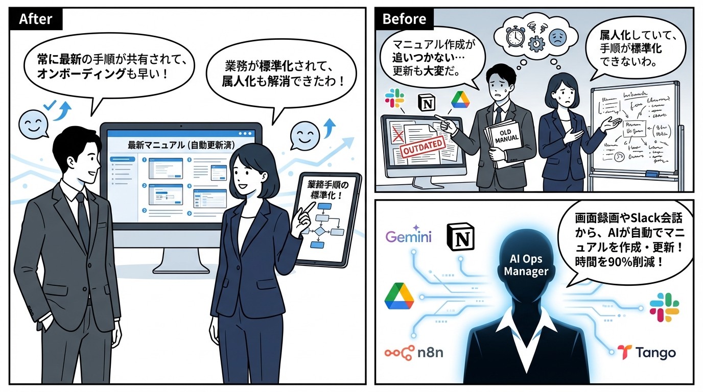 マニュアル作成時間を90%削減。業務手順の標準化により属人化を防止。新入社員のオンボーディング期間が短縮され、常に最新のマニュアルがチーム全体で共有される。
