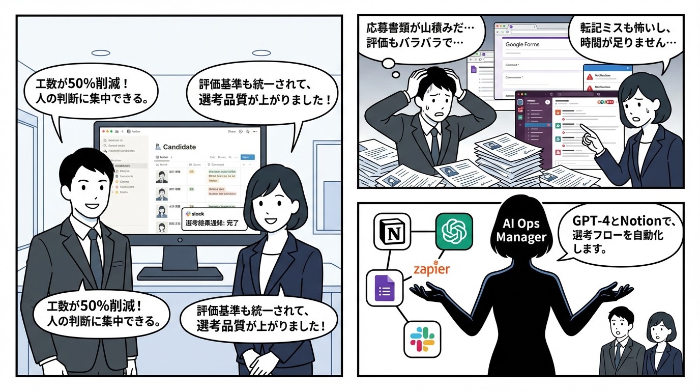 Googleフォームから応募情報をNotionへ自動転記。GPT-4が履歴書と募集要項を照合し、適合度スコアと推薦コメントを自動生成。面接議事録からも自社評価基準に基づいた点数化を実施し、Notionに記録。選考結果はSlackへ自動通知。